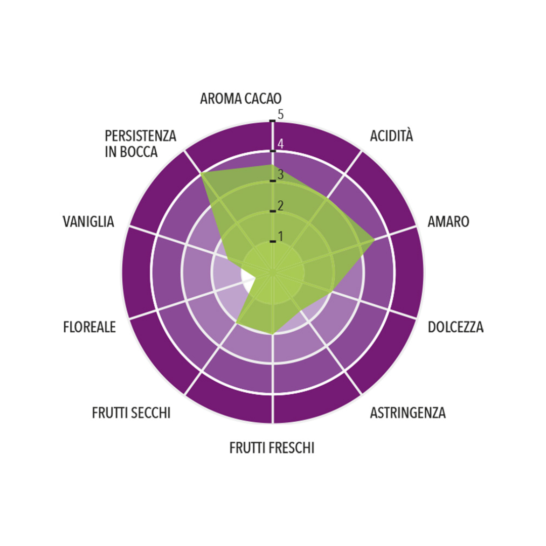Cobertura negra única con un alto contenido de Criollo. Predomina un aroma de gran intensidad y fuerza, con carácter, acidez suave y agradable astringencia.