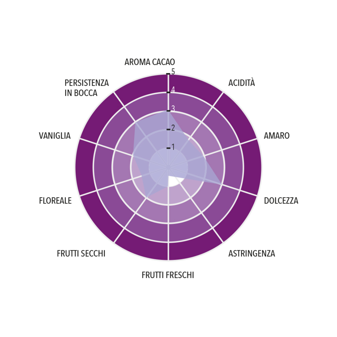 Cobertura negra dulce y agradable, a la vez que intensa y persistente. Perfil cacaotè, con pronunciadas notas a frutos secos y aroma a café.